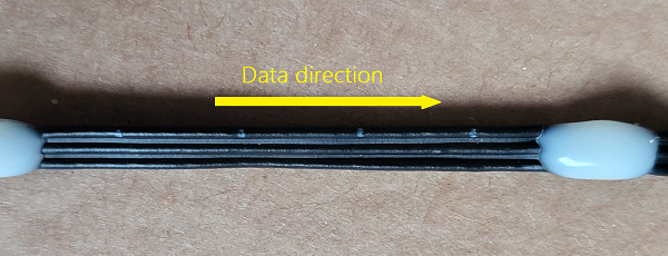 With the positive wire on the top when laid out flat, the data travels in this direction:
