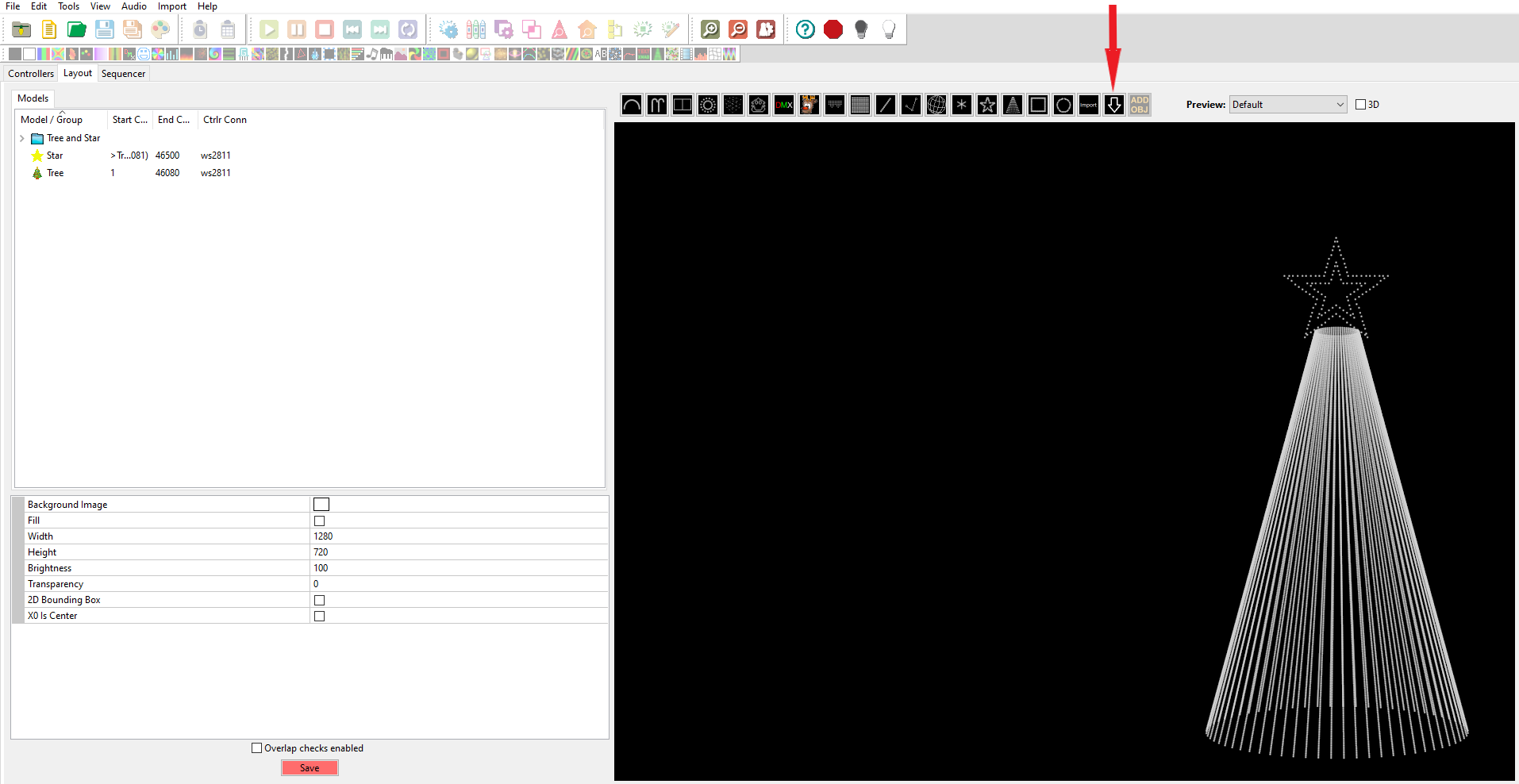 Firstly, open xLights, and go to the layout tab. Once here, you can click the "create new download" button, pointed out by the red arrow below: