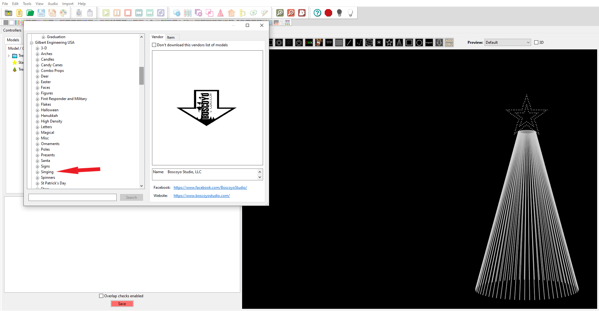Once you have the box created, a new menu will pop up, listing all the downloadable props you can get, as per below. You can scroll up and down through all the manufacturers and models. In this case, as we are using a Gilbert Engineering Singing Tree for the guide, we will open the "singing" category in the Gilbert Engineering section, as per below.
