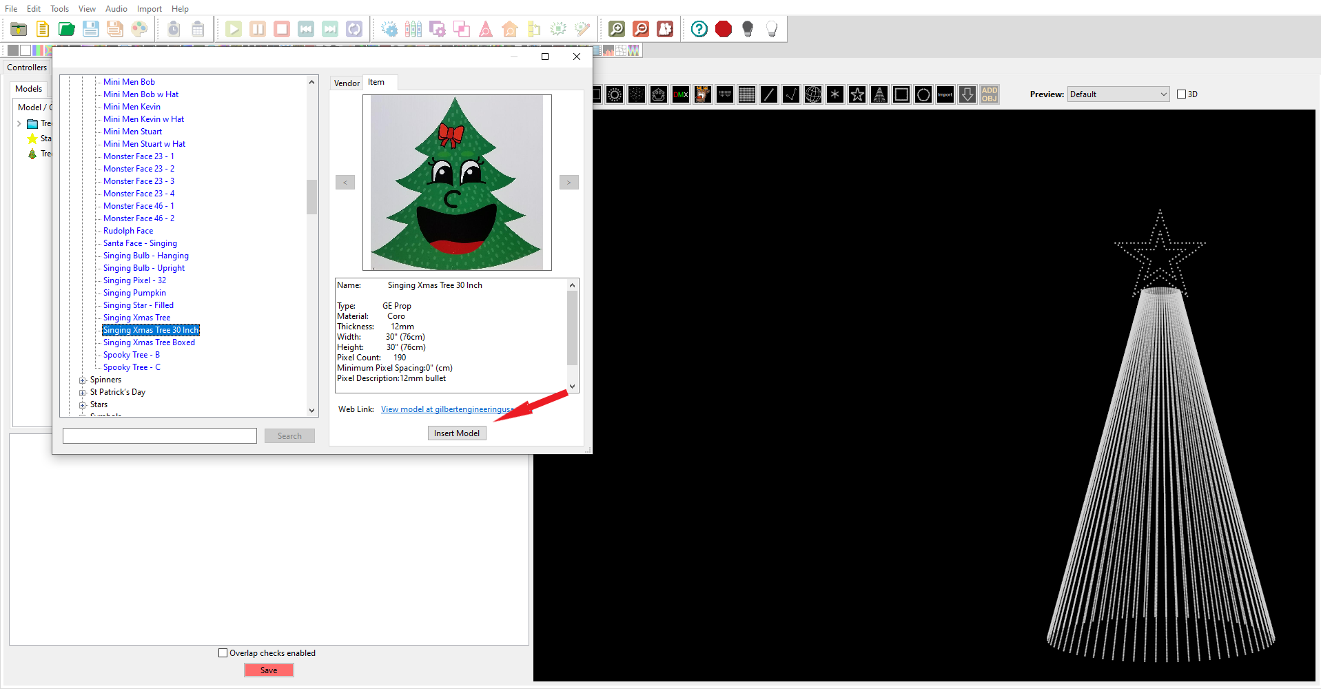 Once inside there, we will select the model we want, in this case the 30" Singing tree. Once selected, you can hit "insert mode" indicated below by the red arrow: