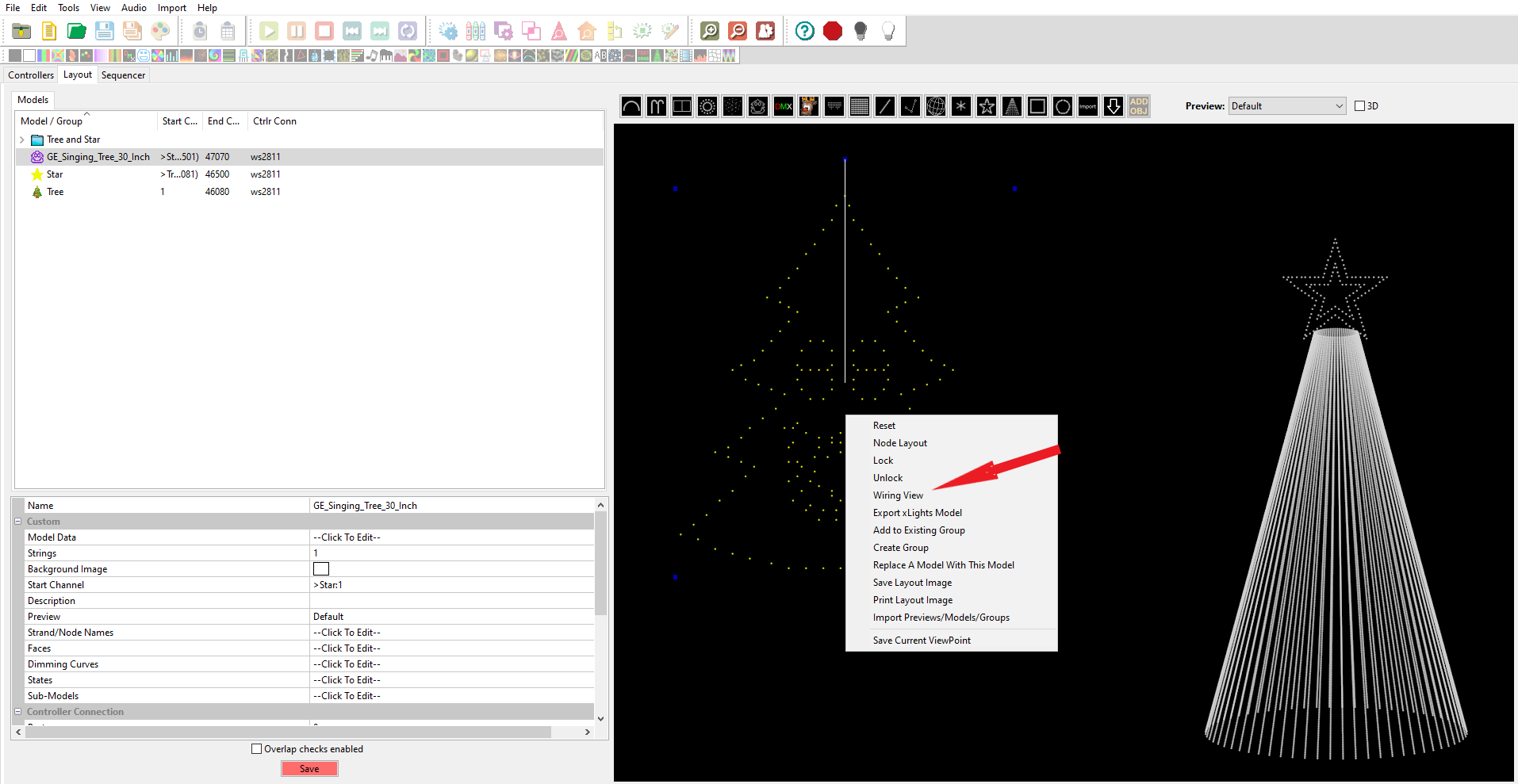 Now that the model is in your layout, you can right click on it to view other options. In this case, we want to see the wiring view, so you can know how to wire the prop up. So, right click with your mouse inside the model to get the menu up, then select "wiring view", as per below: